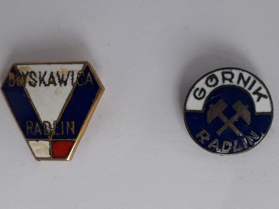 Co do klubu z Niedobczyc, słów kilka...Rymer powstał w 1919 roku i przed wojną nie osiągał większych sukcesów. Natomiast podczas II wojny światowej, po zmianie przez niemieckie władze nazwy na Werkknapen Gemeinschaft Rymergrube, był jedną z najbardziej liczących się drużyn w śląskiej Gaulidze (najwyższa klasa rozgrywek). A zaraz po wojnie ci sami zawodnicy byli trzonem zespołu podczas wywalczenia historycznego awansu do I Ligi (w aktualnej nomenklaturze - ekstaklasy) w 1947 roku. Mimo tak spektakularnych zwycięstw jak 7:2 z Wisłą Kraków Rymer już po jednym sezonie w ekstraklasie musiał się z nią pożegnać, zajmując 13 miejsce.W związku z powyższym K.S. Górnik Radlin niejako w prezencie, nowy sezon rozpocząć miał w II Lidze państwowej.Warto też nadmienić jakim klubem w tych czasach była ,,Emma". Otóż oprócz sekcji piłkarskiej i nowo powstałej w 1949r. sekcji bokserskiej, klub posiadał jeszcze gimnastyczną, handbala (piłki ręcznej), szermierczą, lekkoatletyczną, tenisa stołowego, strzelecką, koszykówki oraz siatkówki męskiej i żeńskiej, (później powstała też s.judo w 1960 czy najmłodsza sekcja pływania w 1981r.) czyli 10 czynnych w tym okresie sekcji!Na zdjęciu dwie emaliowane odznaki, przedwojennej T.S. Błyskawicy i powojennego już K.S. Górnik Radlin.