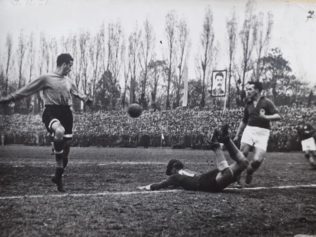 Poniżej, jedno z wielu oryginalnych zdjęć, które zostały wykonane z tego ,,doniosłego" wydarzenia, gdzie nad głowami kibiców widzimy portret bolszewickiego przywodcy Józefa Stalina.