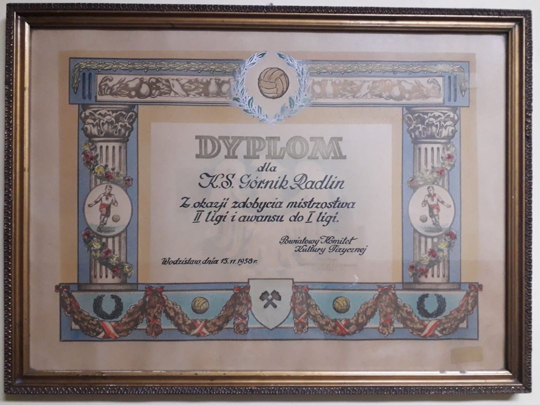 Pamiątką po tym ostatnim (jak się później okaże) awansie do Ekstraklasy, jest przepiękny dyplom w wyjątkowej szacie graficznej i ozdobnej ramce, ofiarowany 15.11.1958r. przez Powiatowy Komitet Kultury Fizycznej w Wodzisławiu Śląskim.