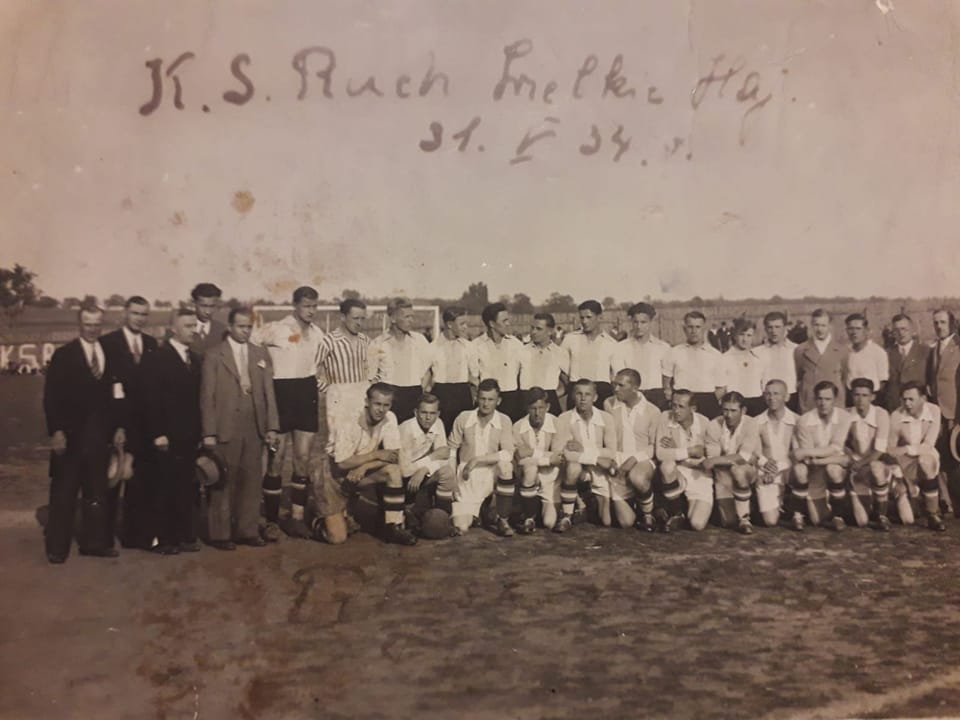 OCALIĆ OD ZAPOMNIENIA czyli Historia Emmy w wyjątkowych przedmiotach. Cz. 6KS Ruch Wielkie Hajduki (od stycznia 1939 Ruch Chorzów) - najbardziej utytułowany i rozpoznawalny śląski klub!14 - krotny Mistrz Polski (w tym 5 przed wojną),3 - krotny zdobywca Pucharu Polski,Ćwierćfinalista Ligi Mistrzów 1974/75Finalista Pucharu Intertoto 1998W klasyfikacji medalowej zajmuje 2 miejsce w rozgrywkach mistrzostw Polski. A w tabeli wszech czasów Ekstraklasy, aktualnie plasuje się na 3 miejscu (nasza Emma na 50 z 86 drużyn, które grały w najwyższej klasie rozgrywkowej), a do połowy lat 90 był na miejscu 1.To tylko najważniejszy spis sukcesów ,,Niebieskich", ale czy trzeba jeszcze bliżej przybliżać tą wielką Markę samą w sobie?!31.05.1934r. Ruch przyjeżdża drugi raz w historii, na nasz Emmaplac. Pierwszy raz nasze drużyny zagrały ze sobą już w roku 1927, dokładnie 2 lutego, przy panującym ostrym mrozie -12°C, gdzie piłkarze musieli schodzić co chwila z boiska, by się odrobinę ogrzać! Mecz ten Błyskawica przegrała 1:3. Natomiast w kolejnych latach spotykać się będziemy jeszcze wielokrotnie, nie tylko podczas meczy towarzyskich, ale także spotkań ligowych. Bilanstychże nie jest zbyt korzystny dla naszej drużyny. W samych tylko oficjalnych 14 meczach wynosi 1 zwyciestwo, 4 remisy i 9 porażek, na korzyść Ruchu. Mimo to, tak w Radlinie, jak i na całym Górnym Śląsku oraz poza jego granicami, ten popularny klub zyskał sobie wielką rzeszę kibiców. Przypomnijmy chociażby jego fan cluby w Niemczech, Holandii, Irlandii, Anglii czy też w Stanach Zjednoczonych!Co do samego meczu rozegranego w Boże Ciało, a tak bardzo rozreklamowanego, omawianym ostatnio napisem, ten zakończył się przegraną Błyskawicy w stosunku 2:7.Na zdjęciu, oprócz skrawka owego napisu z lewej strony, widzimy zawodników oraz działaczy obu klubów.W górnym rzędzie stoją piłkarze Ruchu, a klęczą zawodnicy Błyskawicy.W tym czasie skład drużyny to:Józef Szymura, Roman Latocha, Wilhelm Grüner, Bronisław Grobelny, Jacek Rosa, Henryk Grüner, Ginter Szindler, Oswald Trybuś, Emil Suchanek, Antoni Strodula i Paweł Krumszmidt.Na koniec przypomnieć należy, że 22 kwietnia 2021 roku oba kluby podpisały umowę partnerską. Natomiast przedstawiciele naszego miasta Radlin z władzami klubu Ruch Chorzów podpisali drugą umowę, skupiającej się na akcjach promocyjnych.