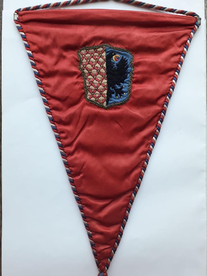 Co do wykonania ww. pamiątkowego proporca, to zastosowano tu czerwoną satynę, a napis wykonano materiałem frotowym tzw. haft wypukły. Z drugiej strony widzimy wyszyty herb, liczącego 43 000 mieszkańców miasta.