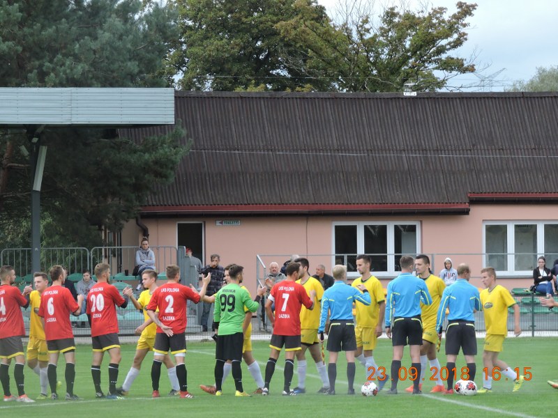 W niedzielne popołudnie nasza drużyna udała się na wyjazd do Łazisk gdzie mieliśmy się zmierzyć z faworyzowaną Polonią. Mecz rozpoczął się od mocnego uderzania naszego zespołu. Już w 2 minucie spotkania dobra akcja prawą stroną Patryk Kraszczyńskiego wyłożenie piłki na 20 metr gdzie był Kamil Szydłowski, który oddał strzał w poprzeczkę. Niespełna minutę później błąd w obronie naszego zespołu. Oddajemy piłkę za darmo napastnikowi Polonii a ten pewnym pięknym strzałem w samo okienko otwiera wynik spotkania. 6 minut później było już 2:0. Chyba w dalszym ciągu byliśmy w poprzedniej akcji. Tym razem wysoka piłka z plecy naszej obrony i zawodnicy Polonii wychodzą w akcji 2 na1. Nasz bramkarz niestety przegrywa ten pojedynek. My również mieliśmy swoje bardzo dobre akcje. M.in. starzał Daniela Chyczewskiego minimalnie mija bramkę. A kilka minut później po dwójkowej akcji Przeliorz-Lubszczyk bramkarz z ledwością wybija piłkę na rzut rożny. Kiedy przyszło nam już nieco uspokoić grę dostajemy kolejnego gola. Kolejny raz dostajemy piłkę za plecy i robi się 3:0. Na druga połowę musieliśmy wyjść bardziej zmotywowani. W jakimś stopniu zmienił się obraz gry. To my prowadziliśmy grę tworzyliśmy akcje. Niestety brakowało celnego strzału. W 51 minucie Wojtek Frycz miał doskonałą okazję po strzale z zrzutu wolnego, jednak brakarz dobrze interweniował na rzut rożny. W 75 minucie powinien być rzut karny. W polu Karnym był faulowany Kraszczyński, sędzia nie zareagował. W 85 minucie w końcu strzelamy gola. Robi się bardzo nerwowo. Gospodarze grają na czas, co raz częściej faulują i przerywają grę. Na zdobycie kolejnego gola zabrakło po prostu czasu. Trzeba przyznać że Polonia w 2 połowie nie stworzyła nic groźnego a nam brakowało szczęścia.